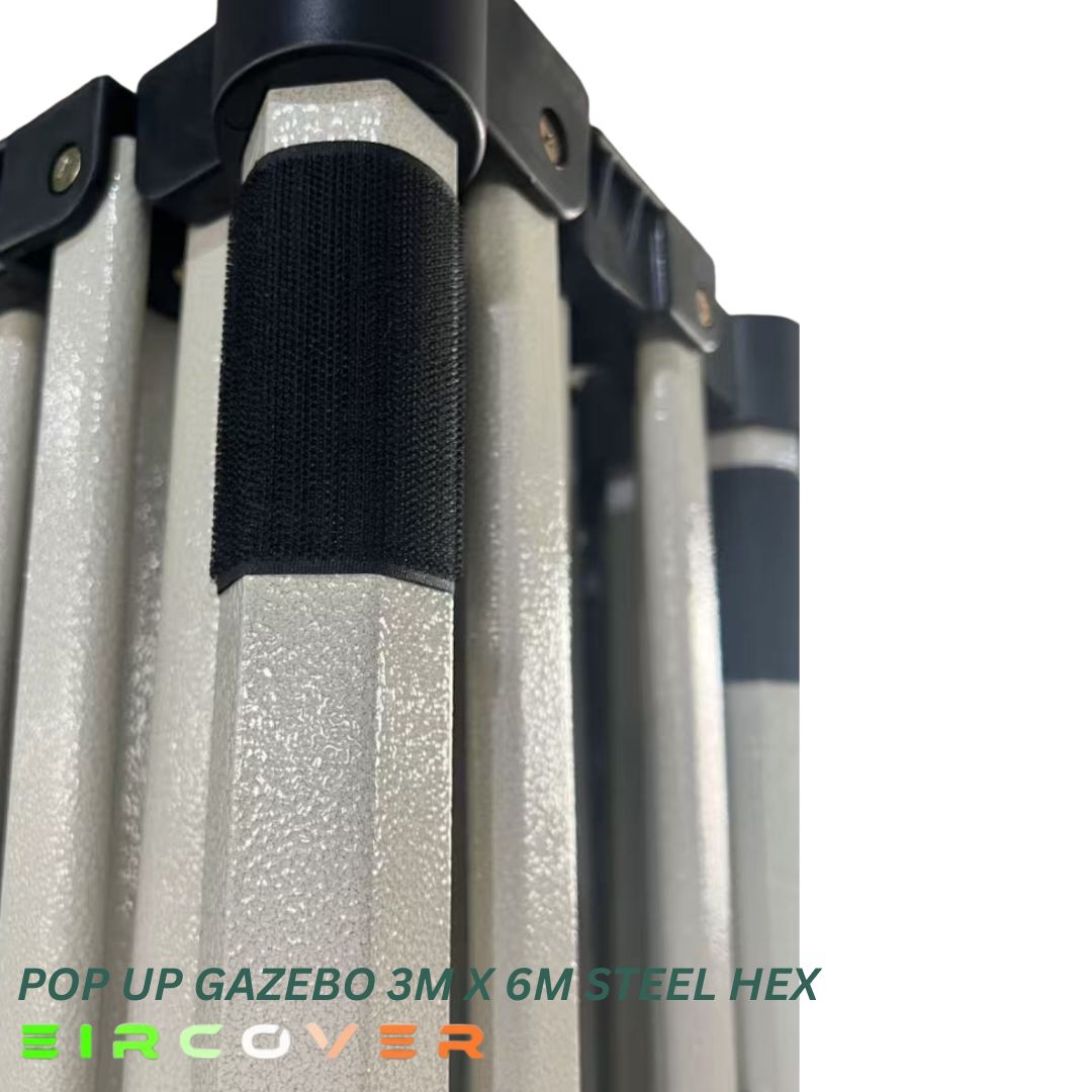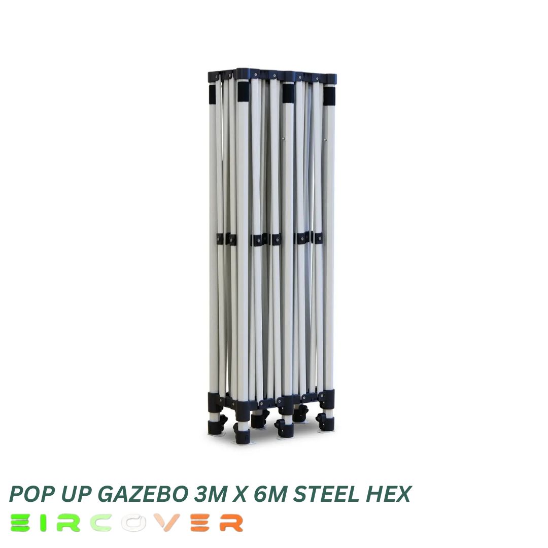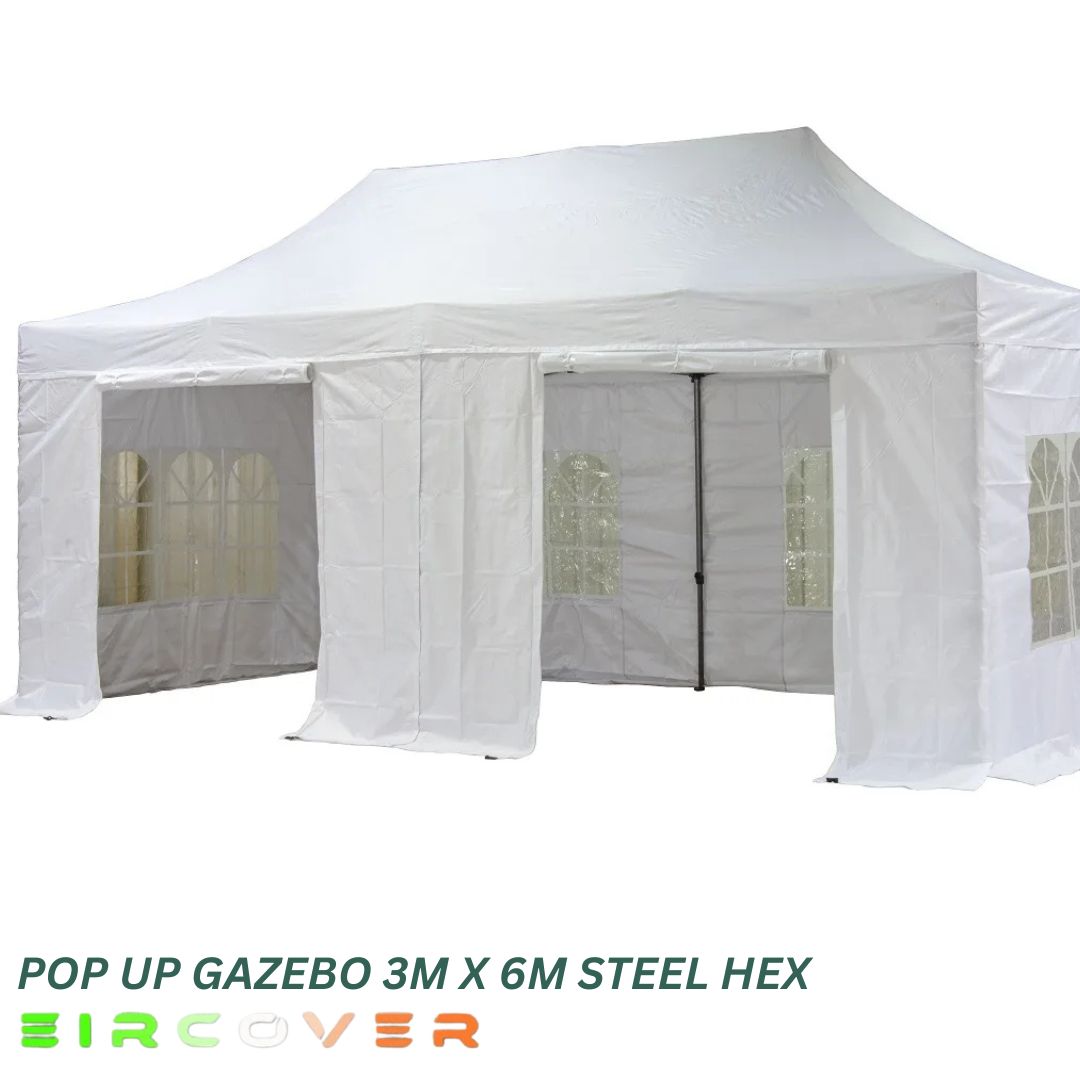 The 3m x 6m (10ft by 20ft) Steel Hex Pop Up Gazebo is a strong and reliable outdoor shelter designed for events, markets, and garden use. Built with a reinforced hexagonal steel frame and premium 420D Oxford PVC-coated canopy, it delivers excellent protection against Irish weather conditions.